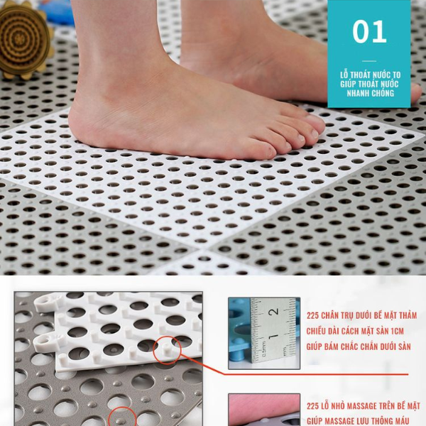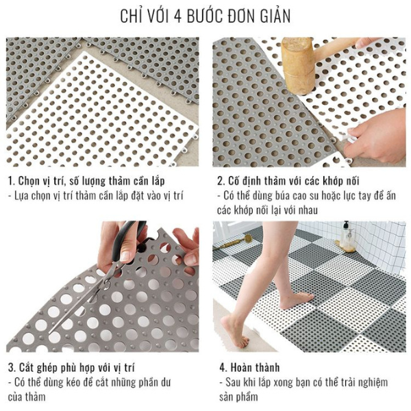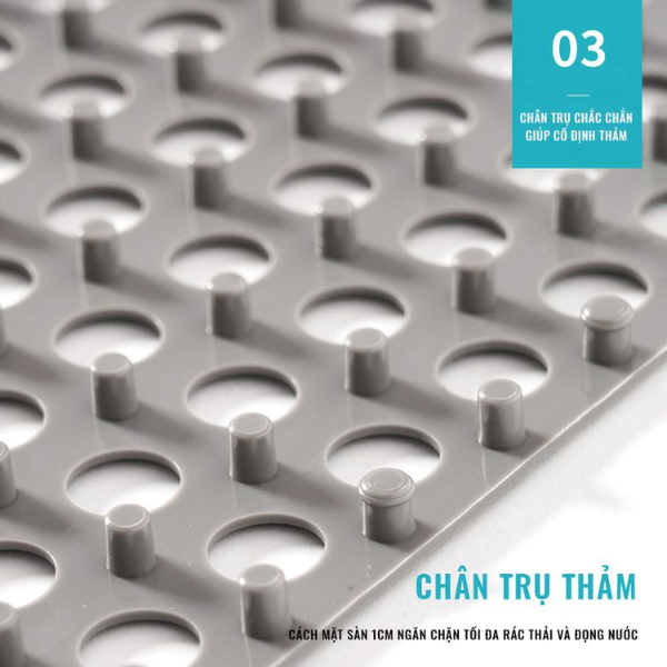 - Thiết kế: Hiện đại, bền bỉ không lo rách. Không bị ẩm mốc, bảo vệ sàn nhà khô ráo, sử dụng trong nhà tắm, phòng khách, nhà bếp. Có thể vệ sinh định kì